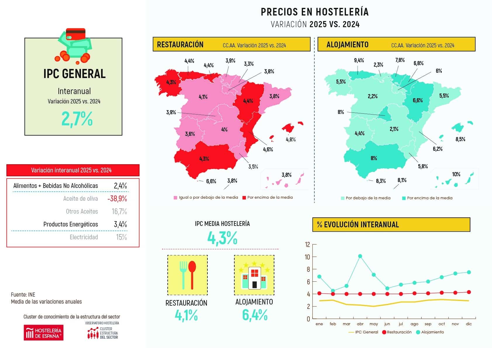 Durante el mes de diciembre, los precios de la restauración, en España, ascendieron una décima hasta el 4,3%. Esta subida ha situado la media anual en el 4,1%. Este crecimiento del IPC ha sido inferior al registrado el pasado año, que alcanzó el 4,7%. Las actividades de alojamiento han registrado una subida de precios del 7,5% en diciembre. La media se sitúa en el 6,4% y, al igual que en la restauración, este valor es algo más moderado que el registrado el año anterior, que fue del 6,6%.