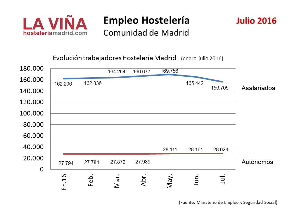 La Hostelería de Madrid emplea en julio a 184.731 personas, lo que supone un crecimiento del 5,3% respecto al mismo mes del año anterior. De ellas, 156.705 son trabajadores asalariados, que aumentan un 6,2% respecto al mismo mes de julio del año anterior, y 28.024 son autónomos, que prácticamente se mantienen en las mismas cifras que el mes de julio del año anterior (0,1%), según los datos publicados por el Ministerio de Empleo y Seguridad Social.
