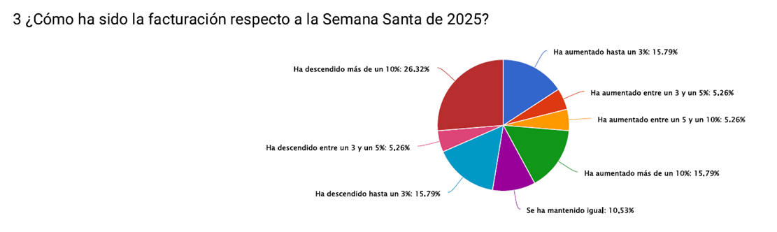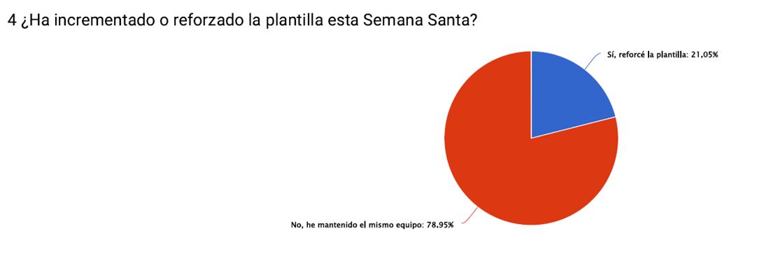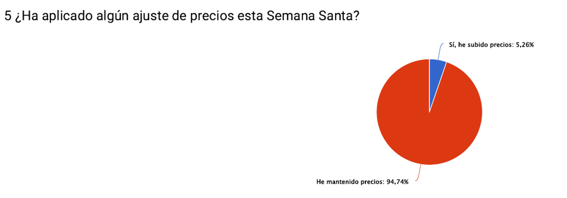 La respuesta del sector ha estado marcada por la prudencia. El 78,95% de los encuestados no reforzó plantilla durante esta Semana Santa y solo el 21,05% incorporó personal adicional. En paralelo, el 94,74% mantuvo sus precios sin cambios, frente a un 5,26% que reconoce haberlos incrementado. Estos datos reflejan una estrategia de contención por parte de los negocios, en un contexto de incertidumbre y con márgenes cada vez más ajustados.