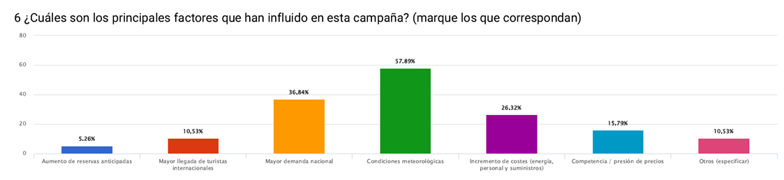 Entre los factores que más han influido en la campaña, los profesionales señalan en primer lugar las condiciones meteorológicas, mencionadas por el 57,89% de los participantes. Le siguen la mayor demanda nacional, con un 36,84%, y el incremento de costes —energía, personal y suministros—, citado por el 26,32%. En menor medida, también se mencionan la competencia y la presión sobre los precios, con un 15,79%; la llegada de turistas internacionales, con un 10,53%; y el aumento de reservas anticipadas, con un 5,26%.