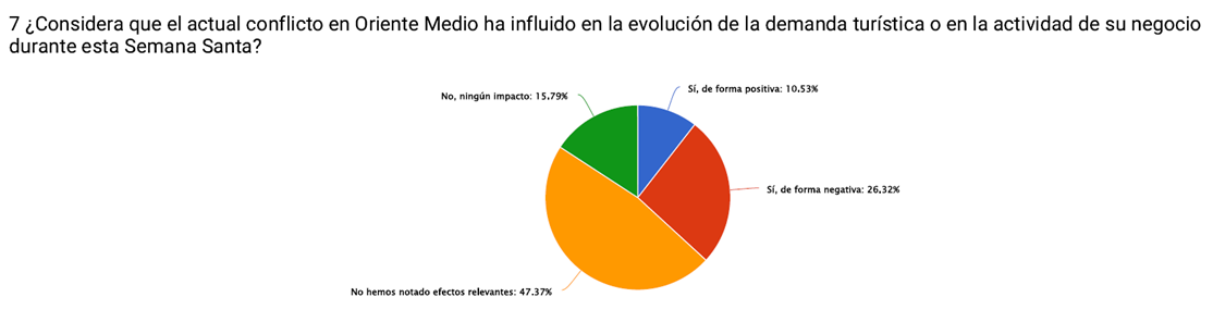 En relación con el contexto internacional, la mayoría de los establecimientos no aprecia una influencia determinante del conflicto en Oriente Medio sobre la evolución de la demanda turística o la actividad del negocio durante esta Semana Santa. Un 47,37% asegura no haber notado efectos relevantes y un 15,79% afirma que no ha tenido ningún impacto, aunque un 26,32% sí percibe una incidencia negativa y un 10,53% considera que ha influido de forma positiva.