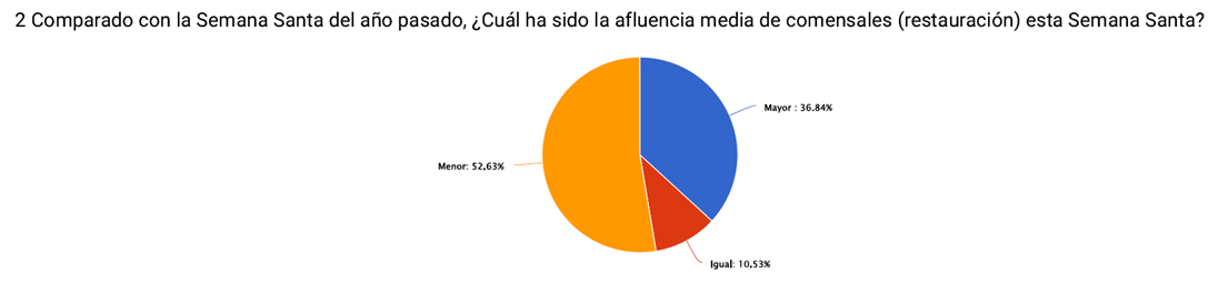 Según la encuesta realizada por Hostelería Madrid para evaluar el comportamiento del sector durante estas fechas, el 52,63% de los negocios consultados asegura haber registrado una menor afluencia de comensales que en la Semana Santa del año anterior, frente al 36,84% que afirma haber experimentado una mayor asistencia y el 10,53% que mantuvo cifras similares.